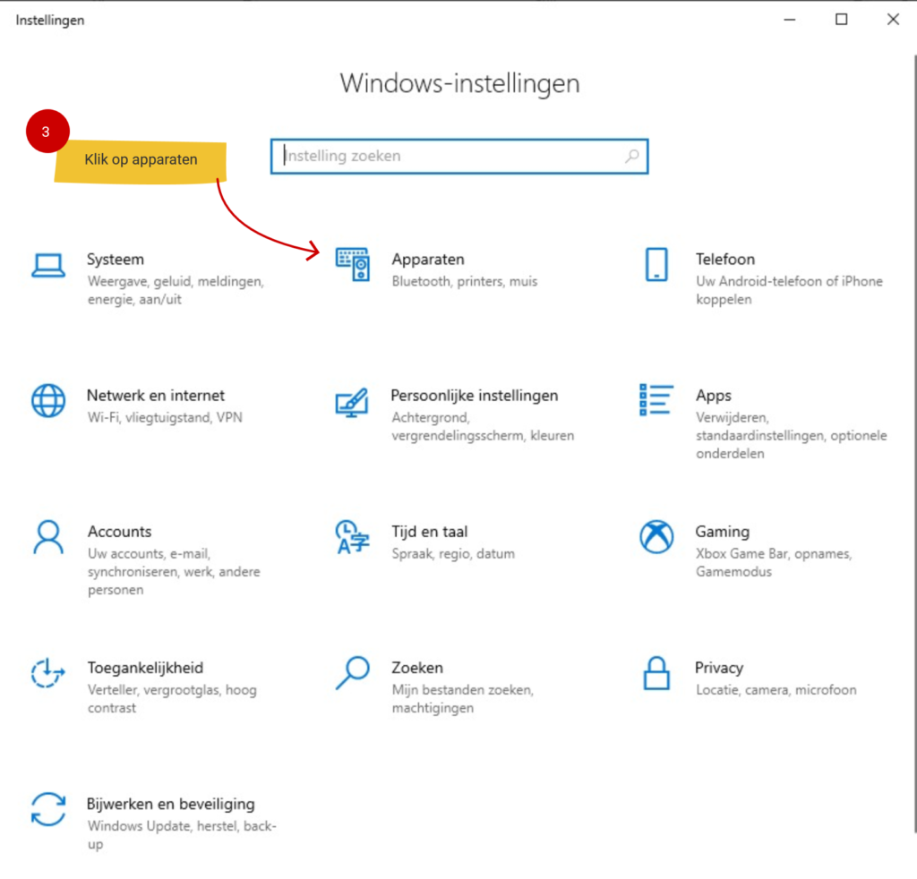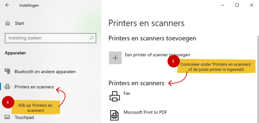 - Controleer of de bonnen naar de juiste printer worden verstuurd. Ga hiervoor eerst op de kassa naar: Menu > Instellingen > Apparaten > Printers en scanners. (zie onderstaande instructie)