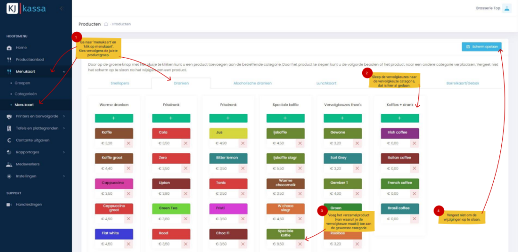 Hoe werkt de opbouw met producten, groepen en categorieën op de menukaart?