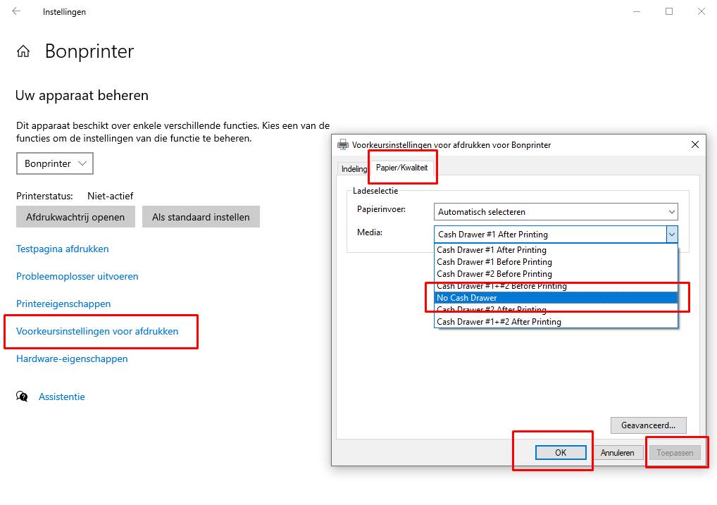 - Klik op de printer die de kassabonnen print