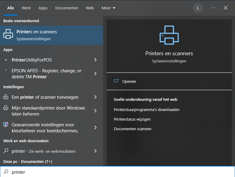 - Klik op de Windows-knop en zoek op ‘printers & scanners’