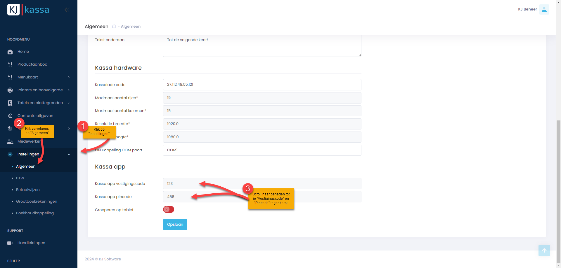 - Zoek de AppVestigingscode en AppPincode op in het beheer of de KJ kassa manager. Vul deze in.