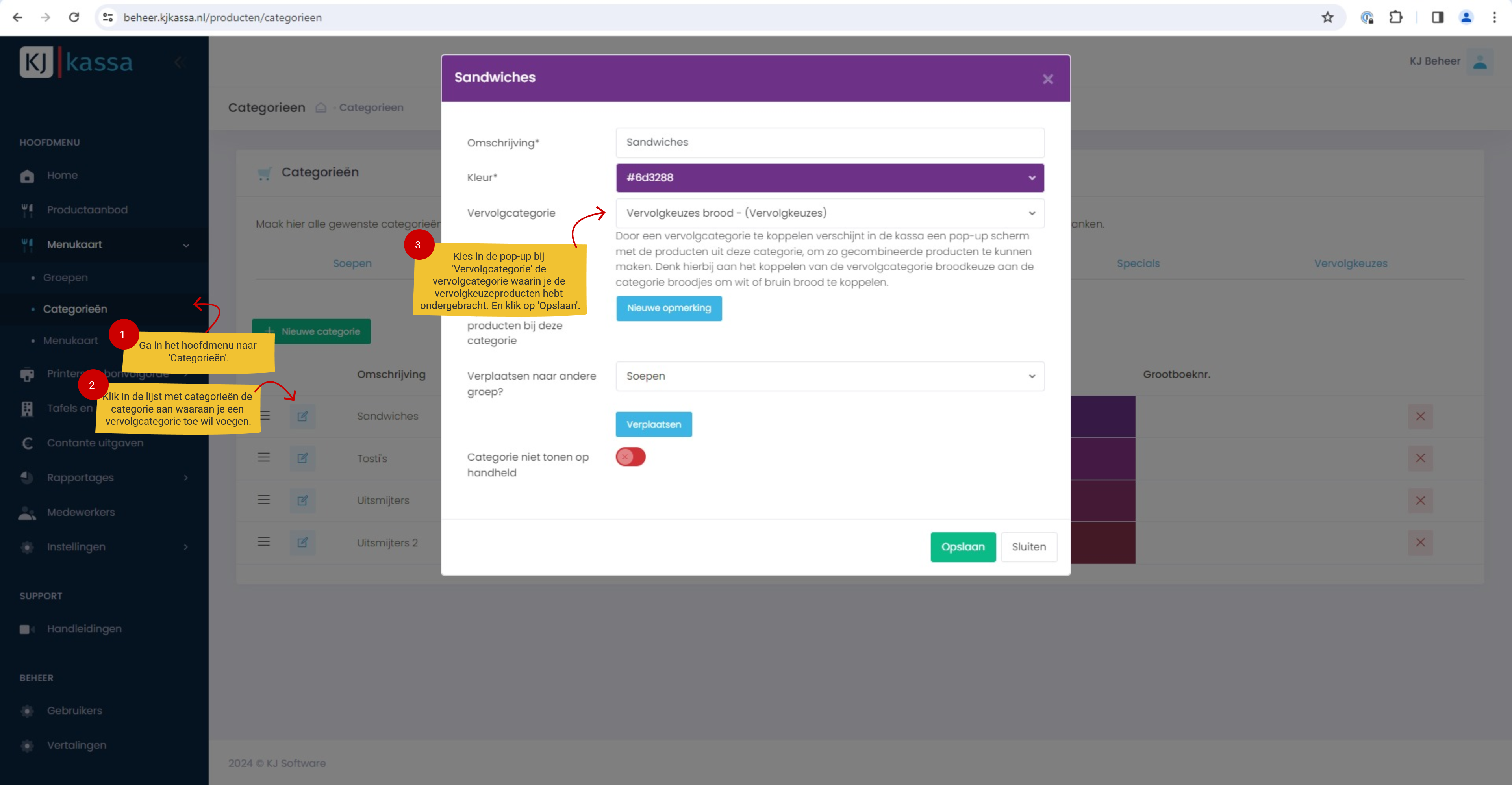 - Zet het schuifje ‘Categorie niet tonen op handheld’ aan. (Anders kan de klant ook vervolgkeuzes los bestellen).